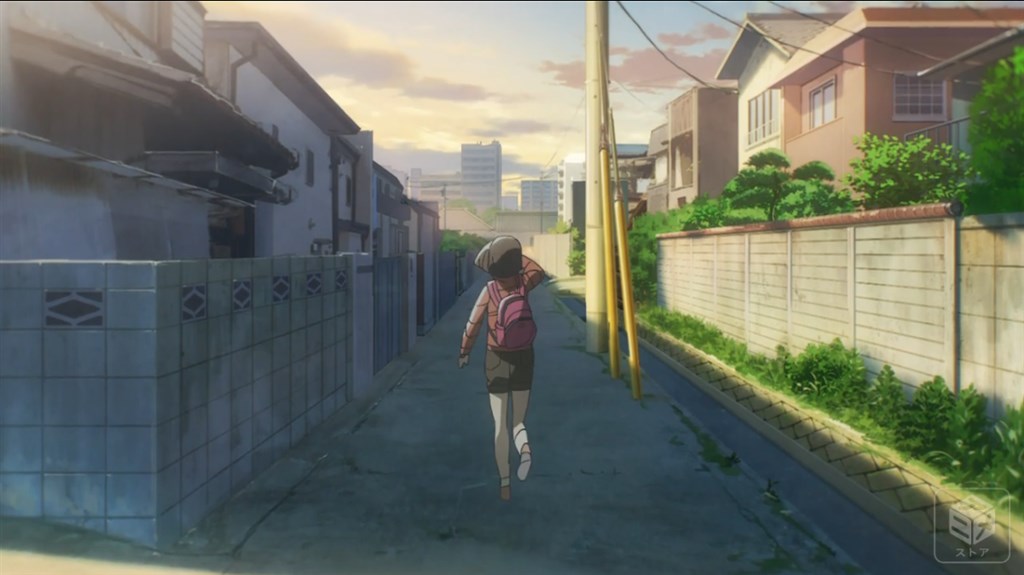 前述してきたことを踏まえればまさしく消失点 (見えないほど遠く) へとキマリが駆けていくバックショットが描かれます。キマリにとっては ”ここではないどこか、遠い場所" へ向かうという意思と意味がしっかりとこのカットに込められていたのでしょう。しかし、以降のカットからこのバックショットって実はめぐっちゃんの主観に近いカットでもあったのかも知れないと分かると、そこには新たな質感が伴われていくことになります。それはキマリが遠くへと行ってしまうというめぐっちゃんの感覚だったり、その背を追いかけ、向こう側へと向かう必要があるのは私も同じなんだという彼女自身の強い想いでもあったのでしょう。言ってしまえば彼女たちは "向こう側" を観ているんですよね。まだ見ぬ虚空に浮かぶ目標とか、夢とか、踏み出すための切っ掛けとか。具体的なことを言葉で言い表すのが難しいのですが、でもしっかりと此処に在るそういうあやふやな感情をグッと私たち受け手にも知らせてくれる。そういう物語的な強度がやはりバックショット*2にはあるんだと思わされるんです。